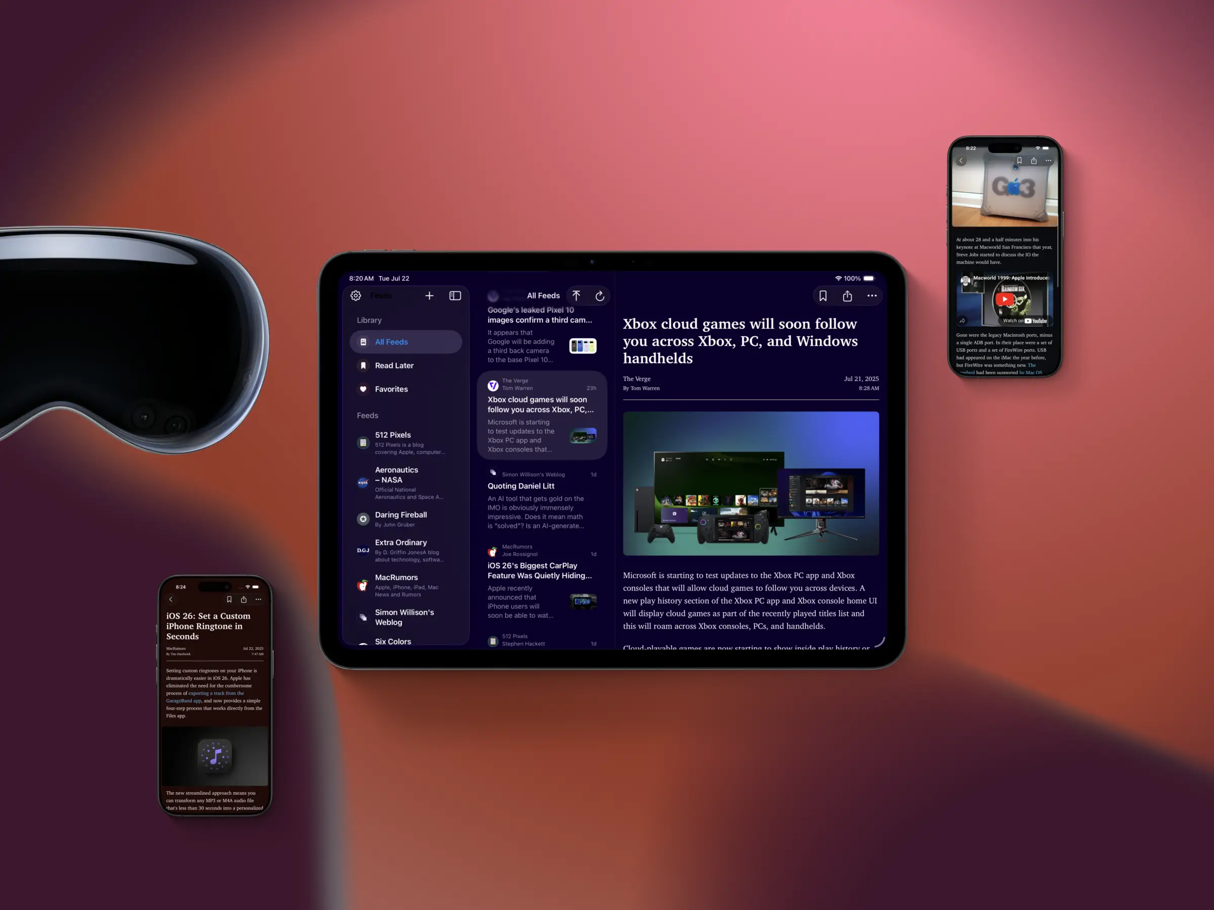 WIPSimple RSS reader with all on-device processing. No accounts, no sync servers. Just your feeds across the Apple ecosystem.